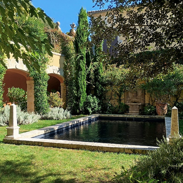 Le choix d’un liner sombre met en valeur les pierres travaillées et valorise l’ouvrage au sein d’un jardin à l’ambiance méditerranéenne. La margelle très épaisse et vieillie donne à la piscine l’aspect d’un bassin d’ornement ancien. Deux obélisques viennent marquer l’entrée dans le bassin, elles aussi taillées au sein de notre atelier dans la même pierre calcaire très vieillie.