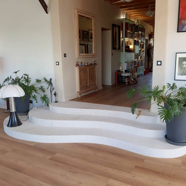 Dans le cadre de la restauration d’une maison ancienne, la pierre pourra être travaillée pour avoir l’aspect d’une pierre vieillie et patinée par le temps, et l’escalier massif s’intègrera ainsi facilement aux pierres d’origine du lieu.